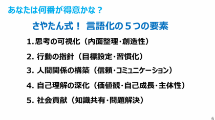 この5つの要素を共有し、皆さんが得意なのは何番ですか?と問いかけたところ、チャット欄が大盛りあがりでした(笑)