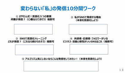- 変わるSNSで変わらない自分をというサブタイトルに勇気をもらえました!発信媒体の変化に動揺しないために、自分らしさを日頃から育てておく大切さを改めて再認識できました。言葉にすることで自己理解と他者からの理解の両方が進むので、これからも更新を続けたいと思いました!